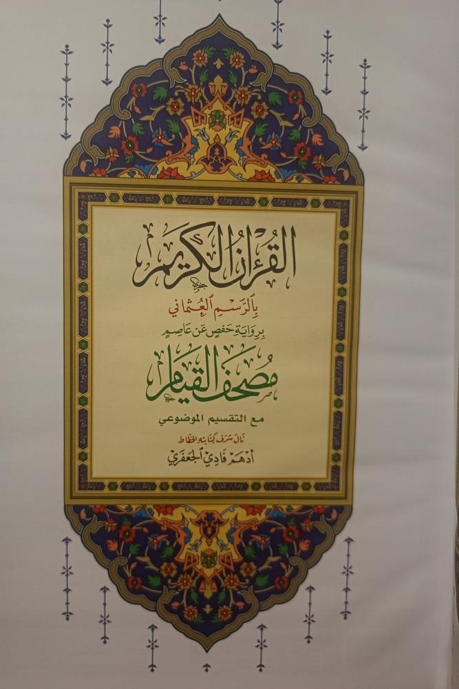 3- وهو مصحف شريف برواية حفص عن عاصم وبجميع القياسات والأحجام والألوان التي يمكن أن تطبع بها المصاحف الشريفة وقد تم إنجاز هذا المصحف الشريف بحيث تم ضغط خمس صفحات من المصحف العادي إلى صفحة واحدة من مصحف القيام مع ضبط السور والآيات وتدوين رقم الصفحة مع الصفحة المقابلة من المصحف الشريف العادي ويتم تطبيق ذلك من خلال آلات طباعة متميزة وحديثة مع المحافظة على الضبط والتشكيل.