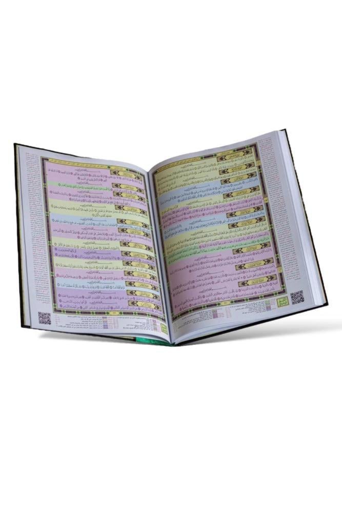 طريقة مبتكرة لتسهيل القراءة من خلال وجود خمس صفحات من القرآن الكريم في صفحة واحدة، ولتسهيل الفهم تم تقسيم الصفحة بألوان مختلفة.